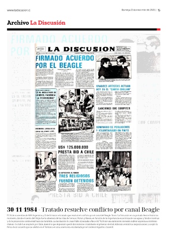El 29 de noviembre de 1984 Argentina y Chile firmaron el tratado que resolvió el conflicto por el canal del Beagle. Diario La Discusión en su portada llevó el histórico
