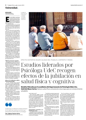 del retiro laboral es la pérdida de En Chile, reveló la docente, “las en la salud”, explicó. una manera más pausada”.