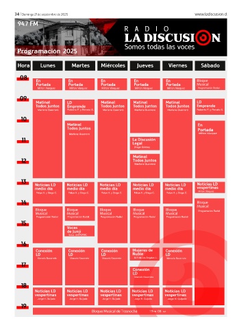 34 Domingo 21 de septiembre de 2025 www.ladiscusion.cl Bloque Musical Bloque Musical Bloque Bloque Bloque Bloque Bloque Musical Musical Musical Musical Musical Bloque Musical de Trasnoche 19 PM 08 AM
