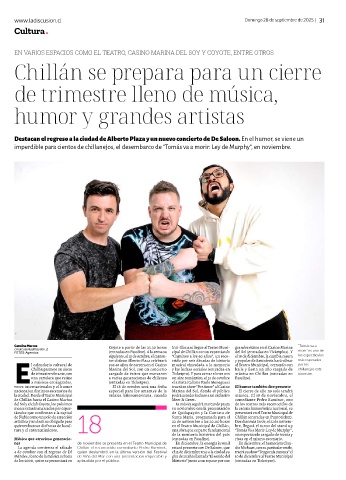Destacan el regreso a la ciudad de Alberto Plaza y un nuevo concierto de De Saloon. En el humor, se viene un